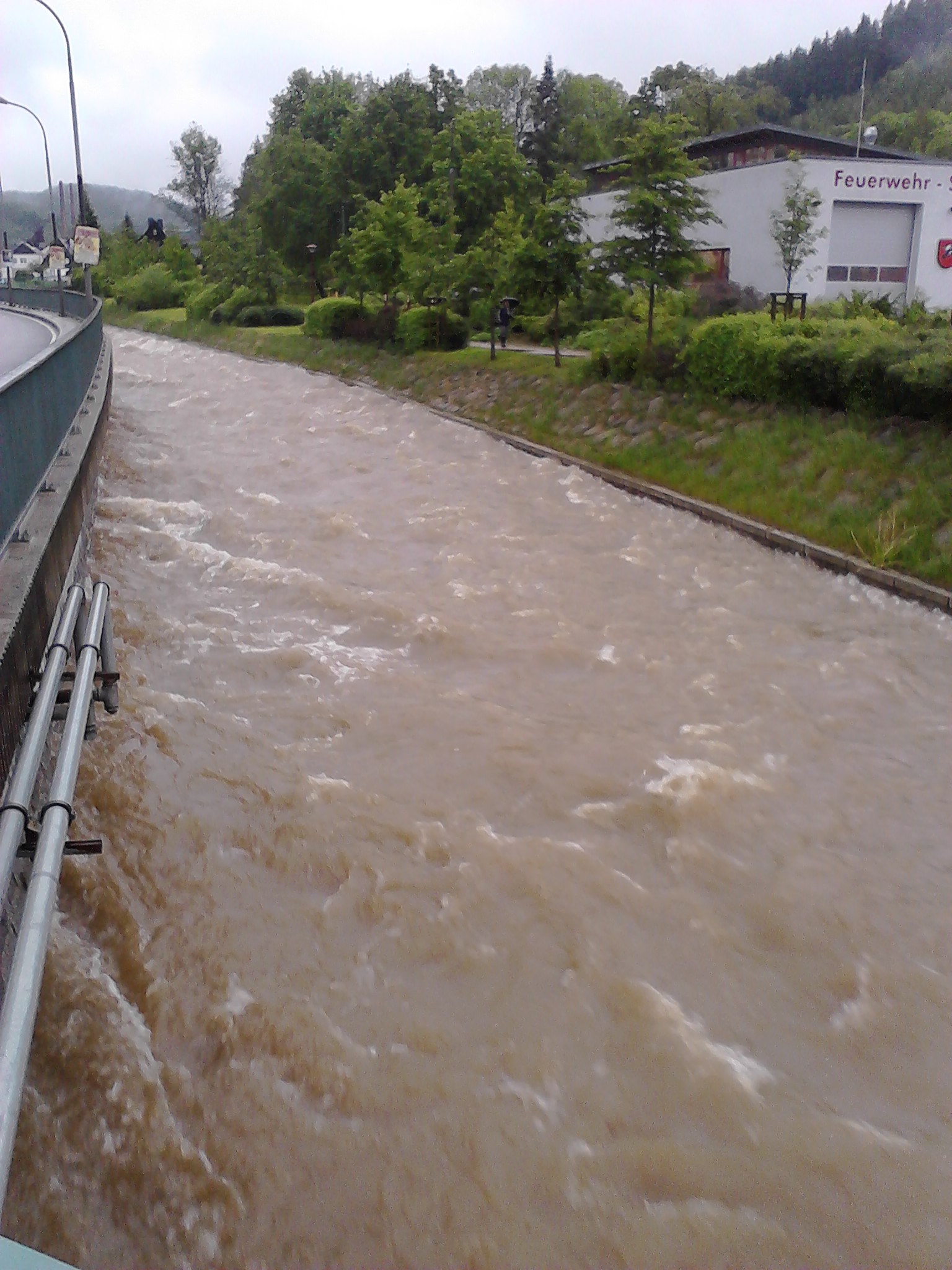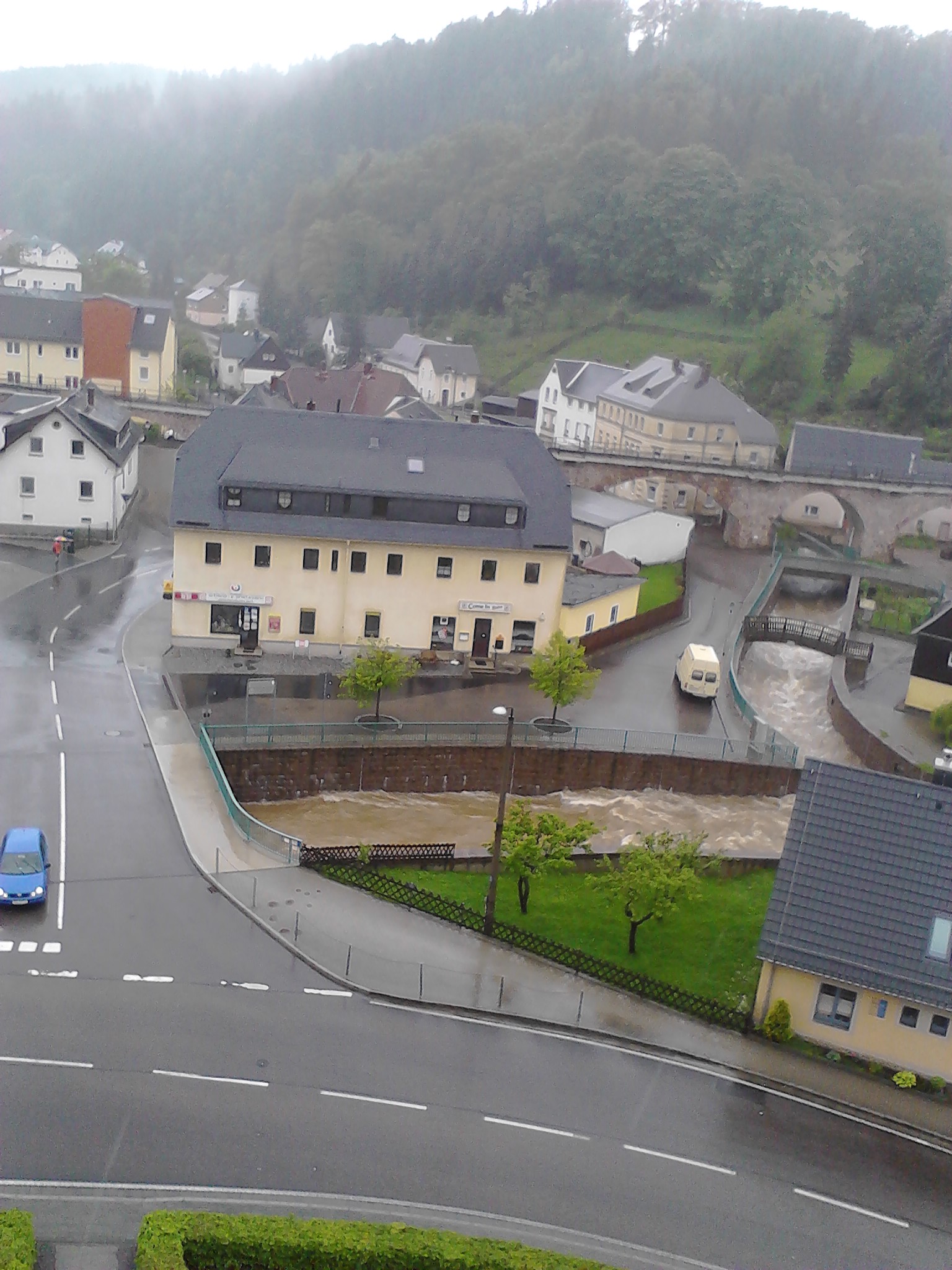 Die Rote Weißeritz ist in Schmiedeberg in ihrem Bett geblieben und und der Pegel fällt seit Sonntag nachmittag wieder. Trotzdem blubbern im Garten noch Quellen und von hinten aus dem Hang läuft es auch. Unsere Begegnungsstätte ist aber trocken geblieben.